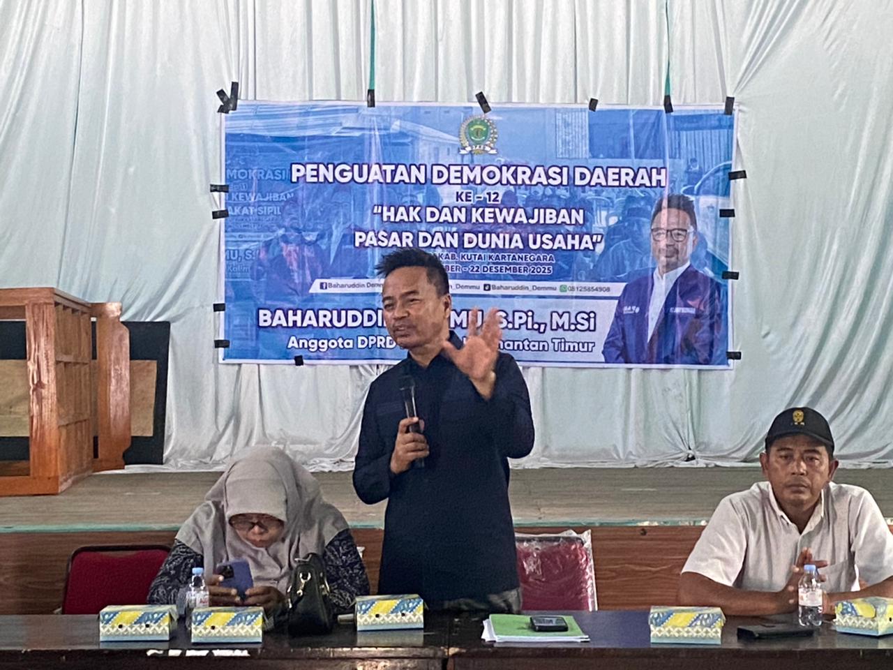 Kutai Kartanegara — Anggota DPRD Provinsi Kalimantan Timur, Baharuddin Demmu, kembali menggelar kegiatan Penguatan Demokrasi Daerah ke-12 dengan mengangkat tema Hak dan Kewajiban Pasar serta Dunia Usaha. Kegiatan ini dilaksanakan pada Minggu, (21/12/25), bertempat di Desa Sidomukti, Kecamatan Muara Kaman, Kabupaten Kutai Kartanegara.