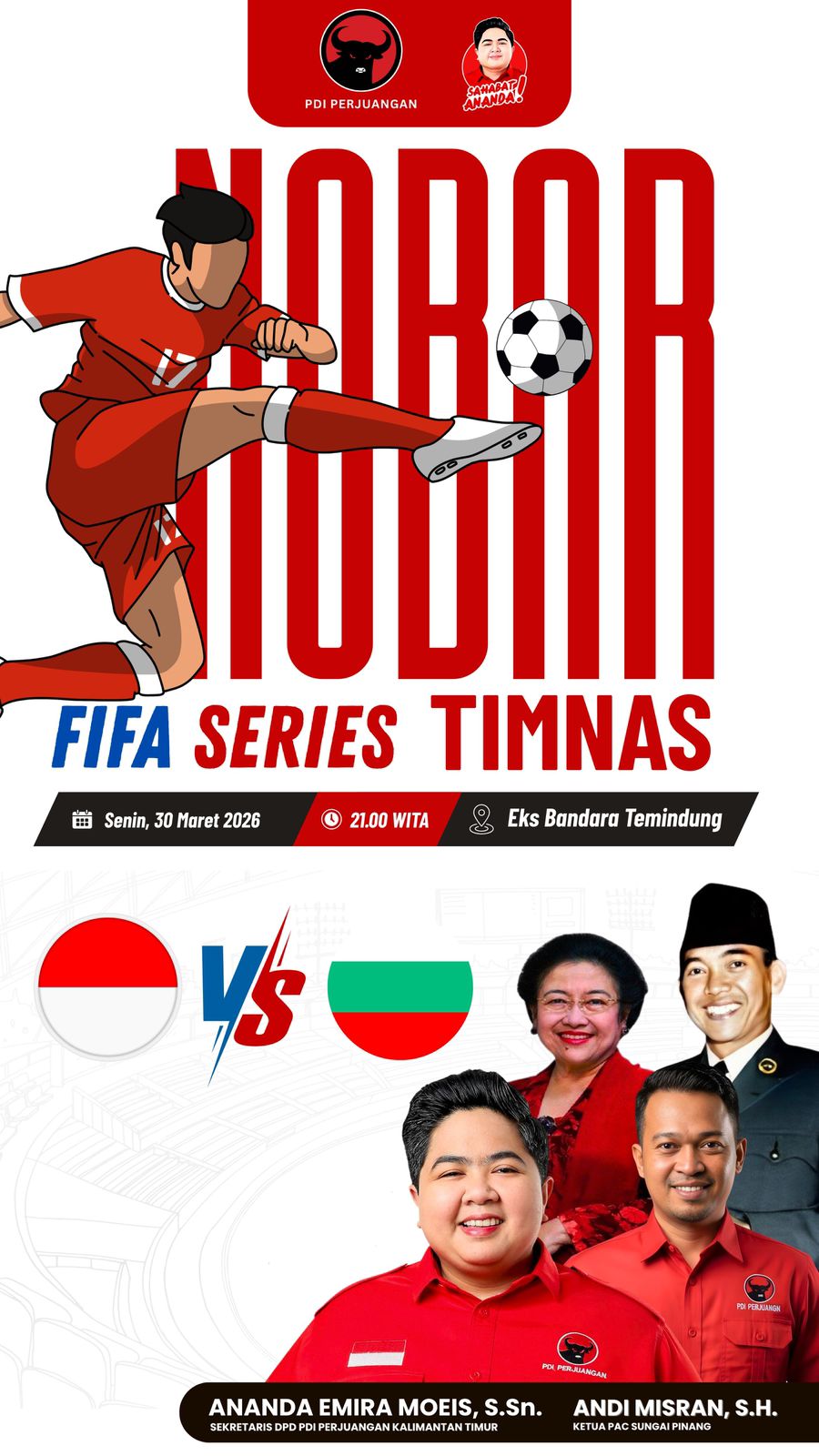 Samarinda — Ratusan warga memadati kawasan Eks Bandara Temindung, Samarinda saat gelaran nonton bareng (nobar) final FIFA Series antara Indonesia melawan Bulgaria, Senin (30/3/2026) malam. Kegiatan yang diinisiasi PAC PDI Perjuangan Sungai Pinang ini berlangsung meriah, dipenuhi sorak sorai dukungan untuk tim Garuda.